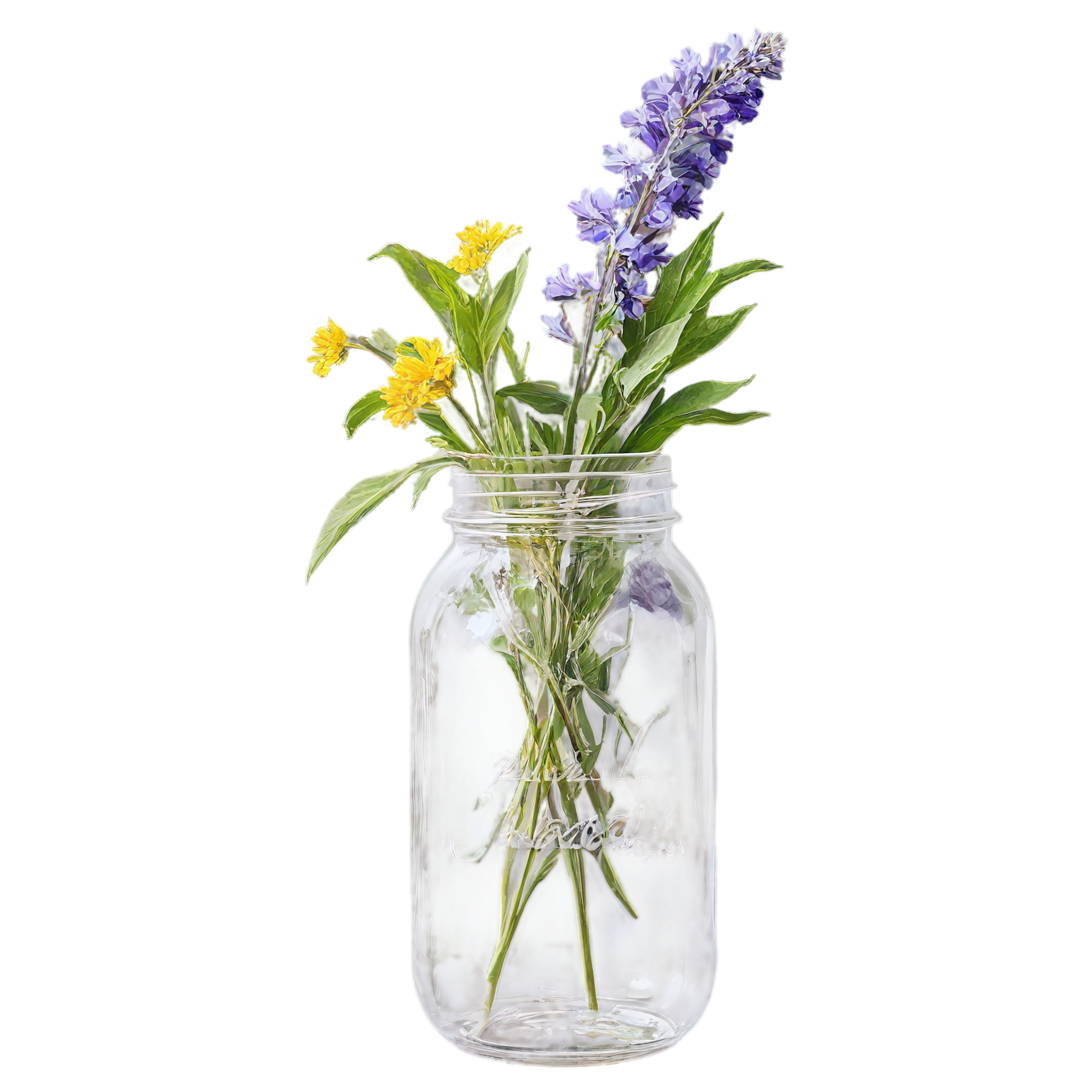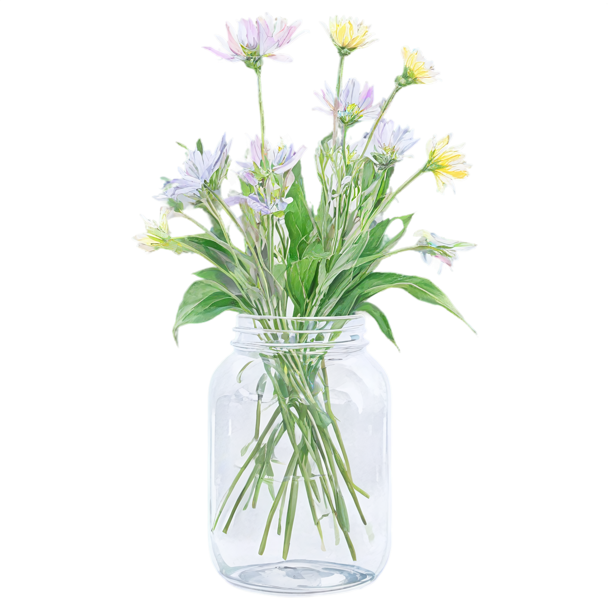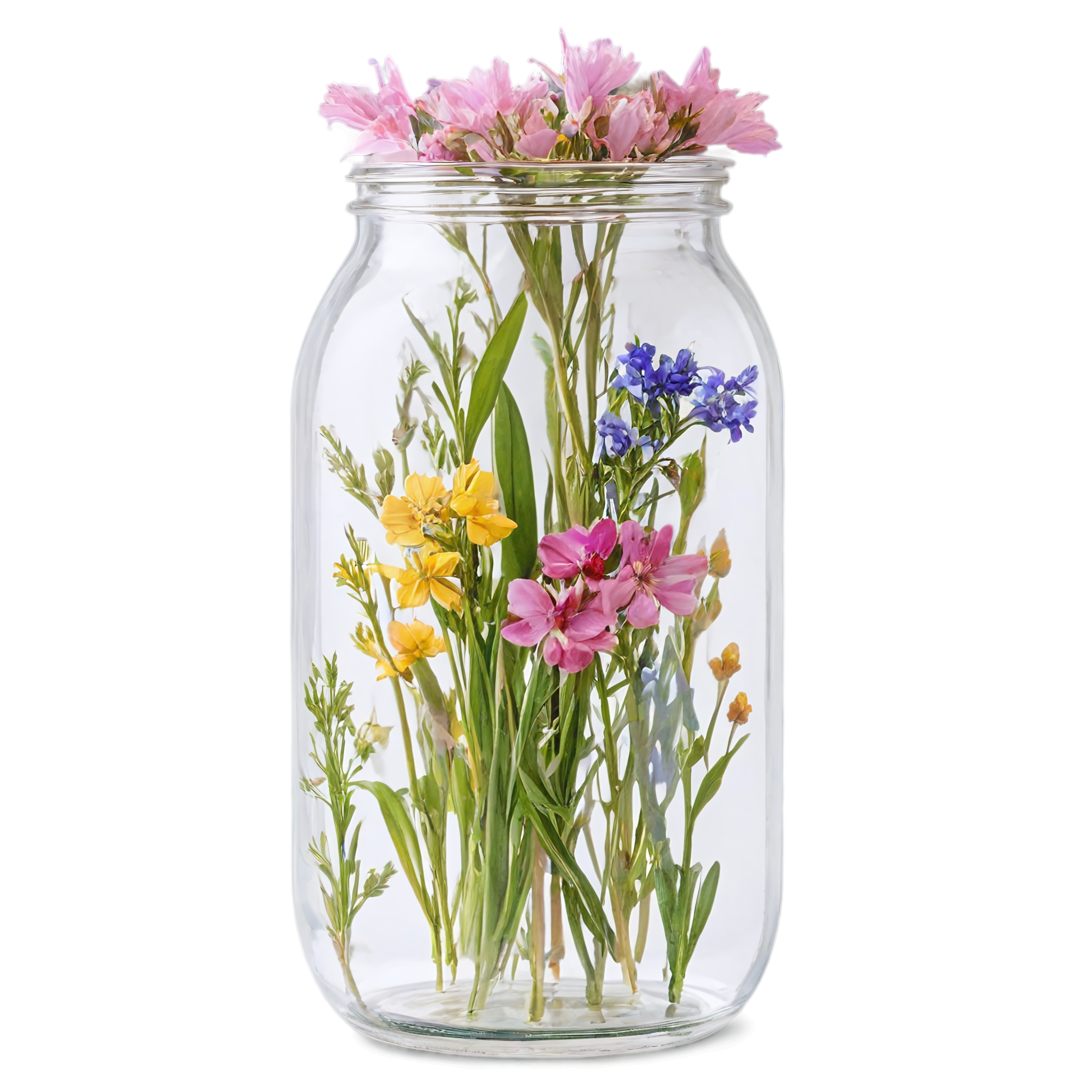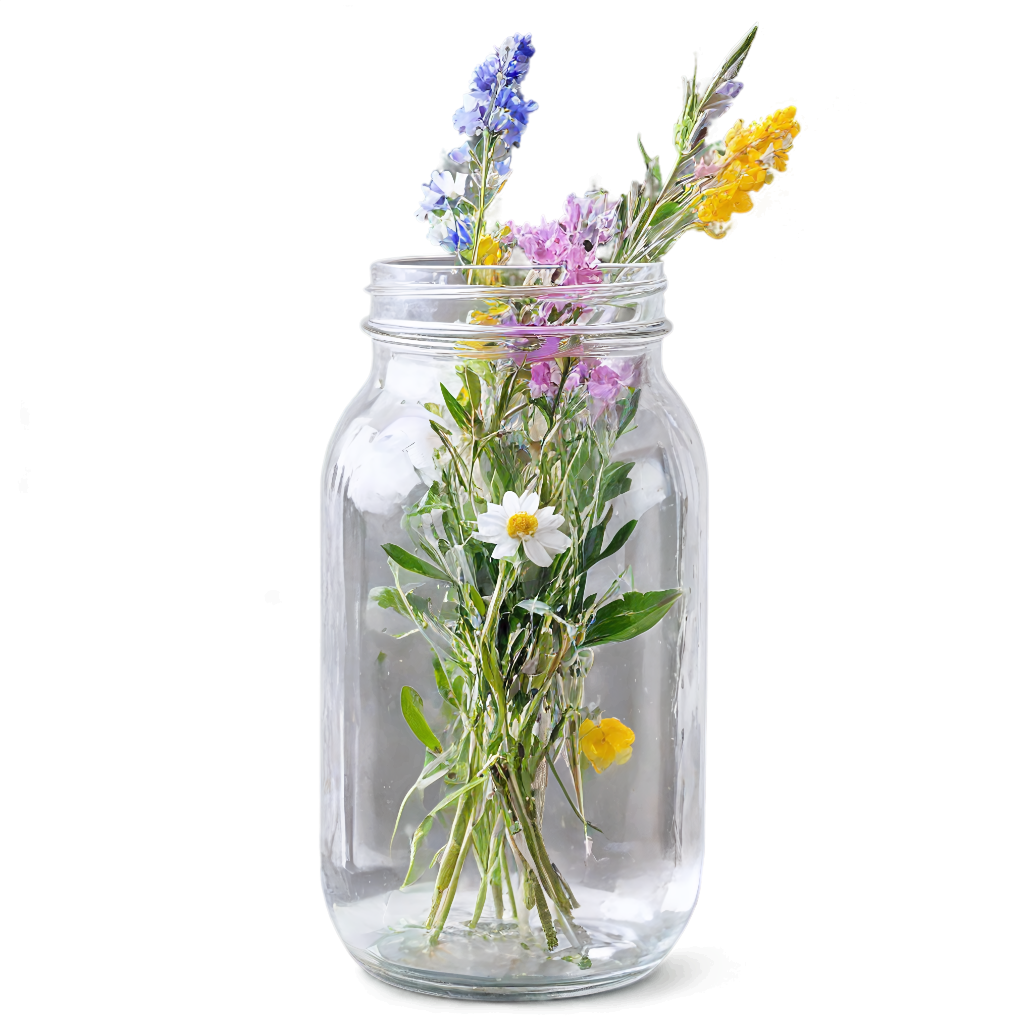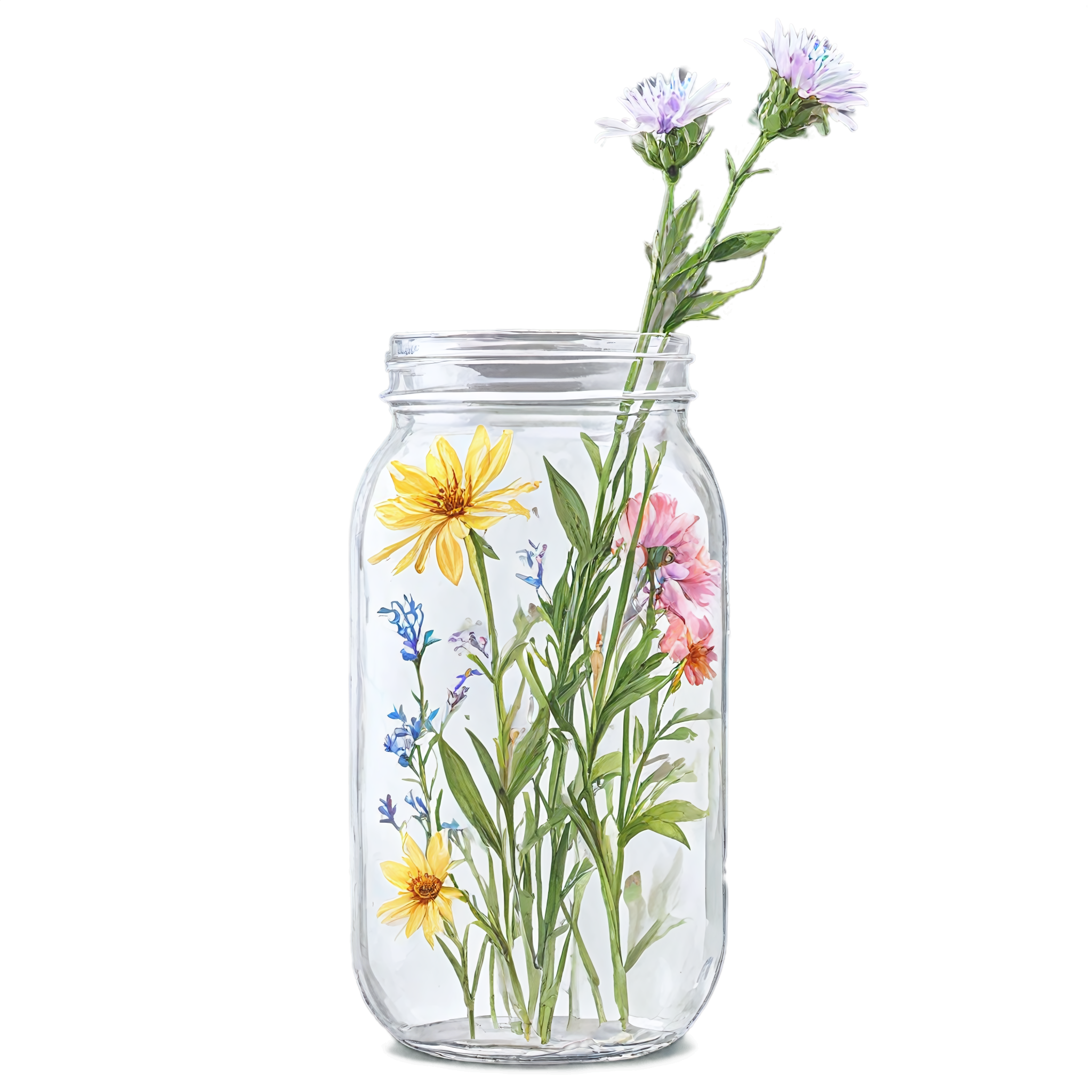 Wildflower clipart images are standalone botanical illustrations — watercolor-style bouquets, individual stems, and floral arrangements — saved as transparent PNG files. Unlike stock photos that include backgrounds, clipart elements are designed to be layered: drop them onto a wedding invitation, a greeting card template, a planner page, or a social media post and they blend seamlessly with your design. These wildflower-in-a-jar compositions pair the organic charm of meadow blooms with the familiar shape of a glass vessel, creating versatile elements that work in rustic, cottage, boho, and modern design styles alike. Each image in this collection was generated with AI-assisted watercolor techniques, curated for color accuracy, and exported at 2048x2048 pixels with a fully transparent background.