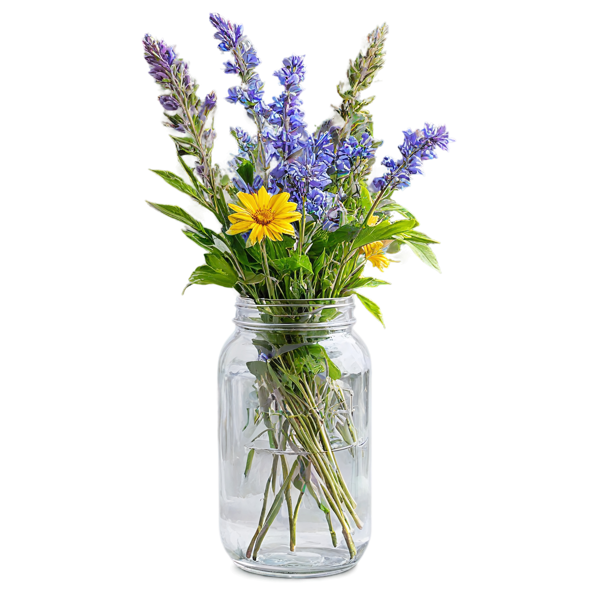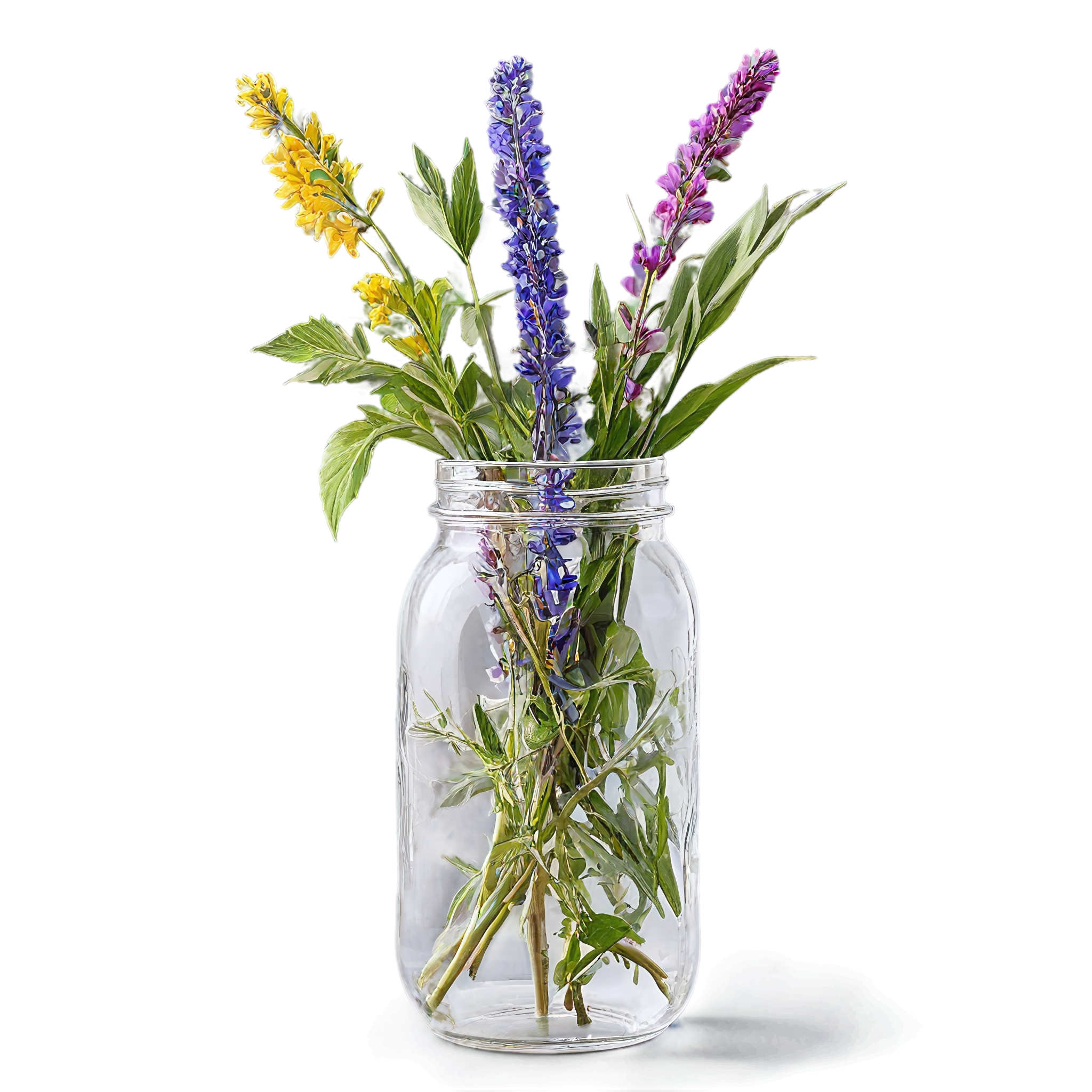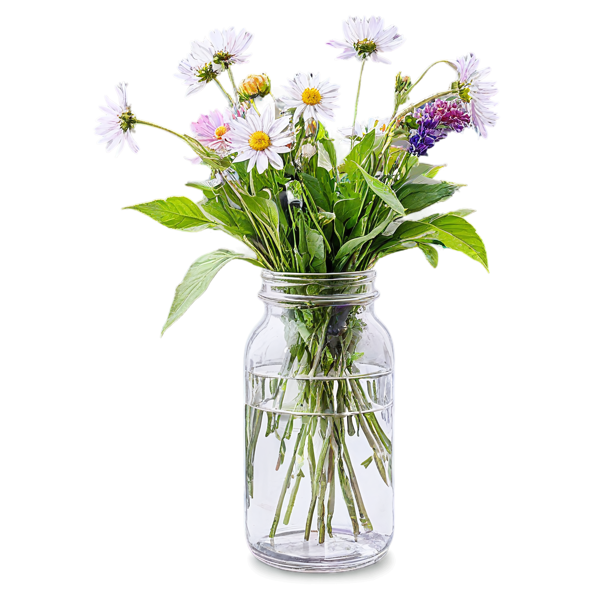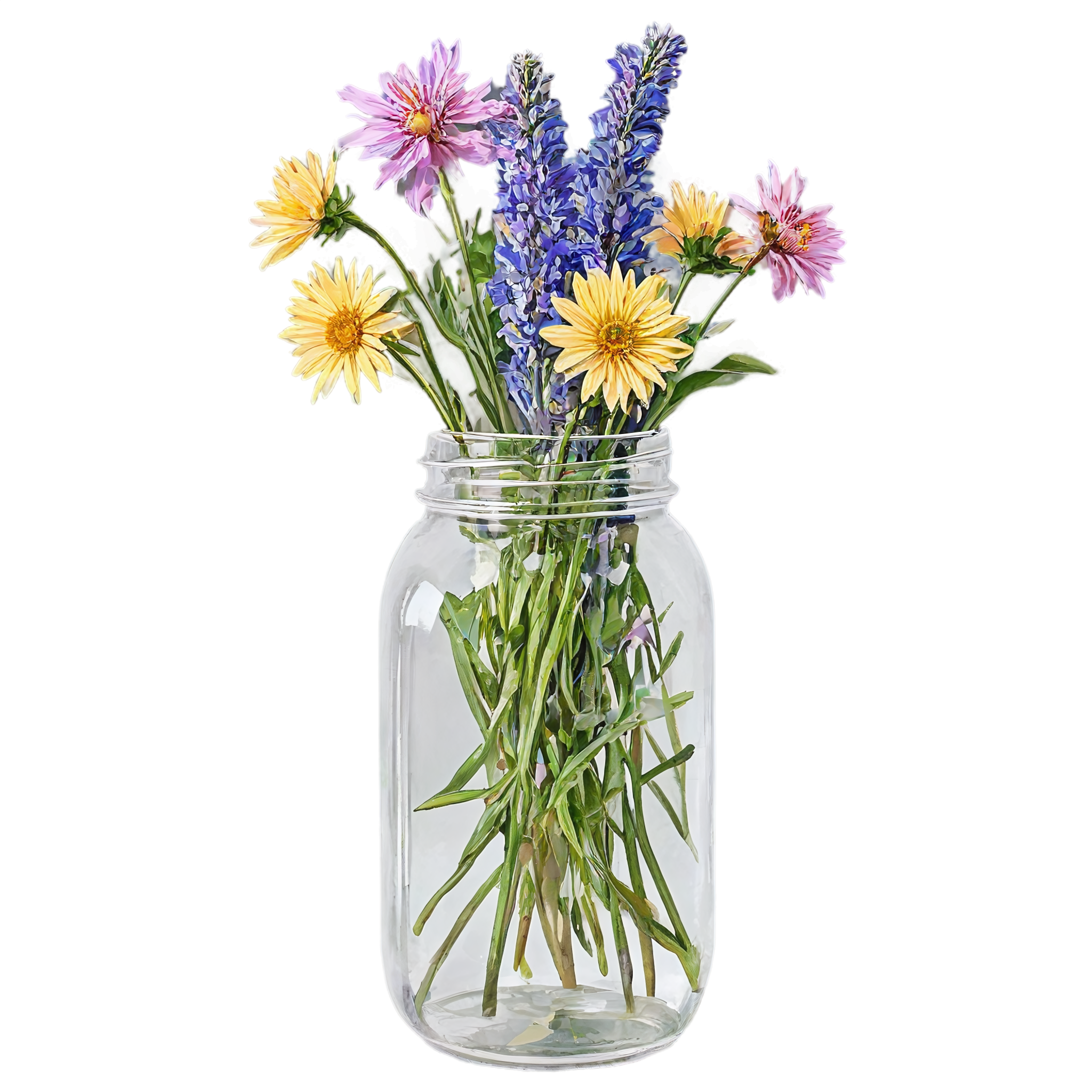 Wildflower clipart images are standalone botanical illustrations — watercolor-style bouquets, individual stems, and floral arrangements — saved as transparent PNG files. Unlike stock photos that include backgrounds, clipart elements are designed to be layered: drop them onto a wedding invitation, a greeting card template, a planner page, or a social media post and they blend seamlessly with your design. These wildflower-in-a-jar compositions pair the organic charm of meadow blooms with the familiar shape of a glass vessel, creating versatile elements that work in rustic, cottage, boho, and modern design styles alike. Each image in this collection was generated with AI-assisted watercolor techniques, curated for color accuracy, and exported at 2048x2048 pixels with a fully transparent background.