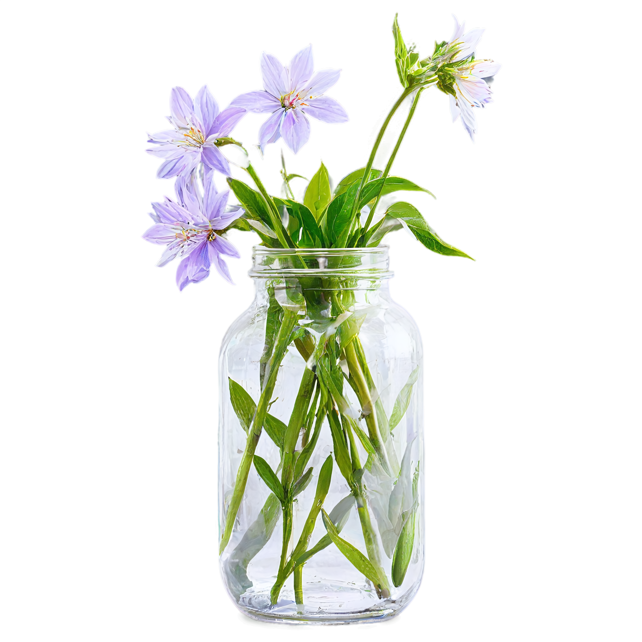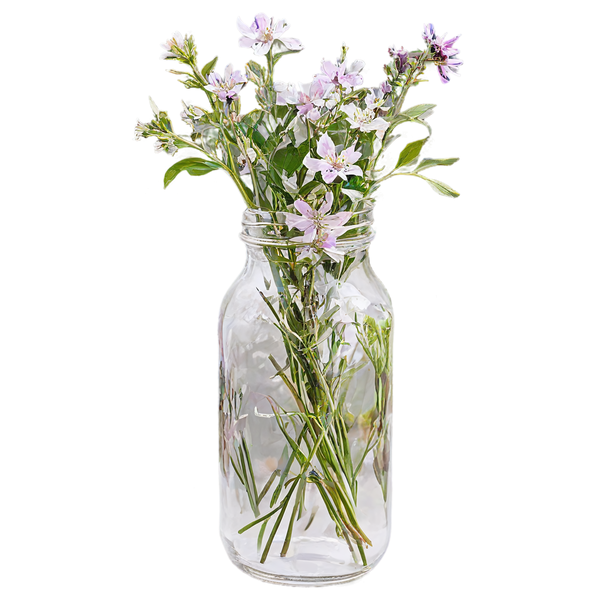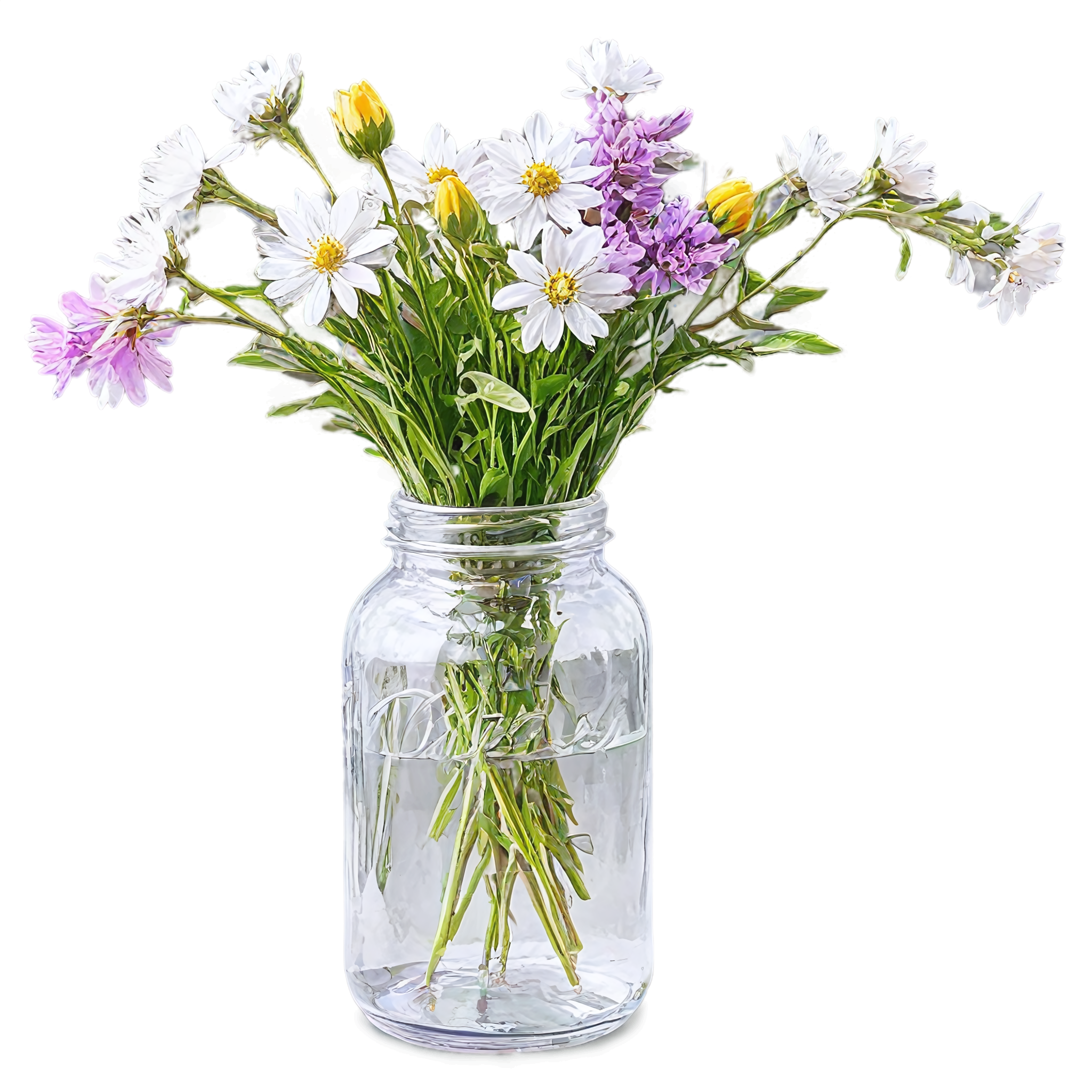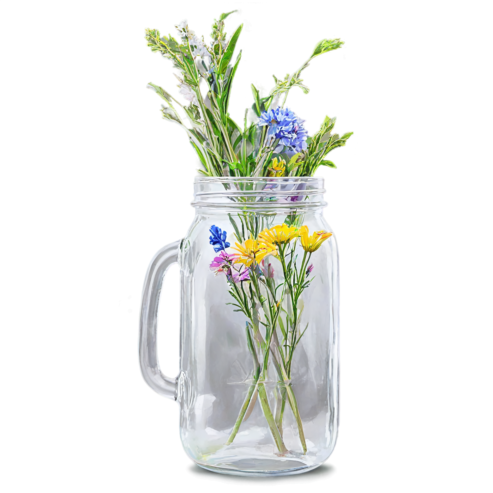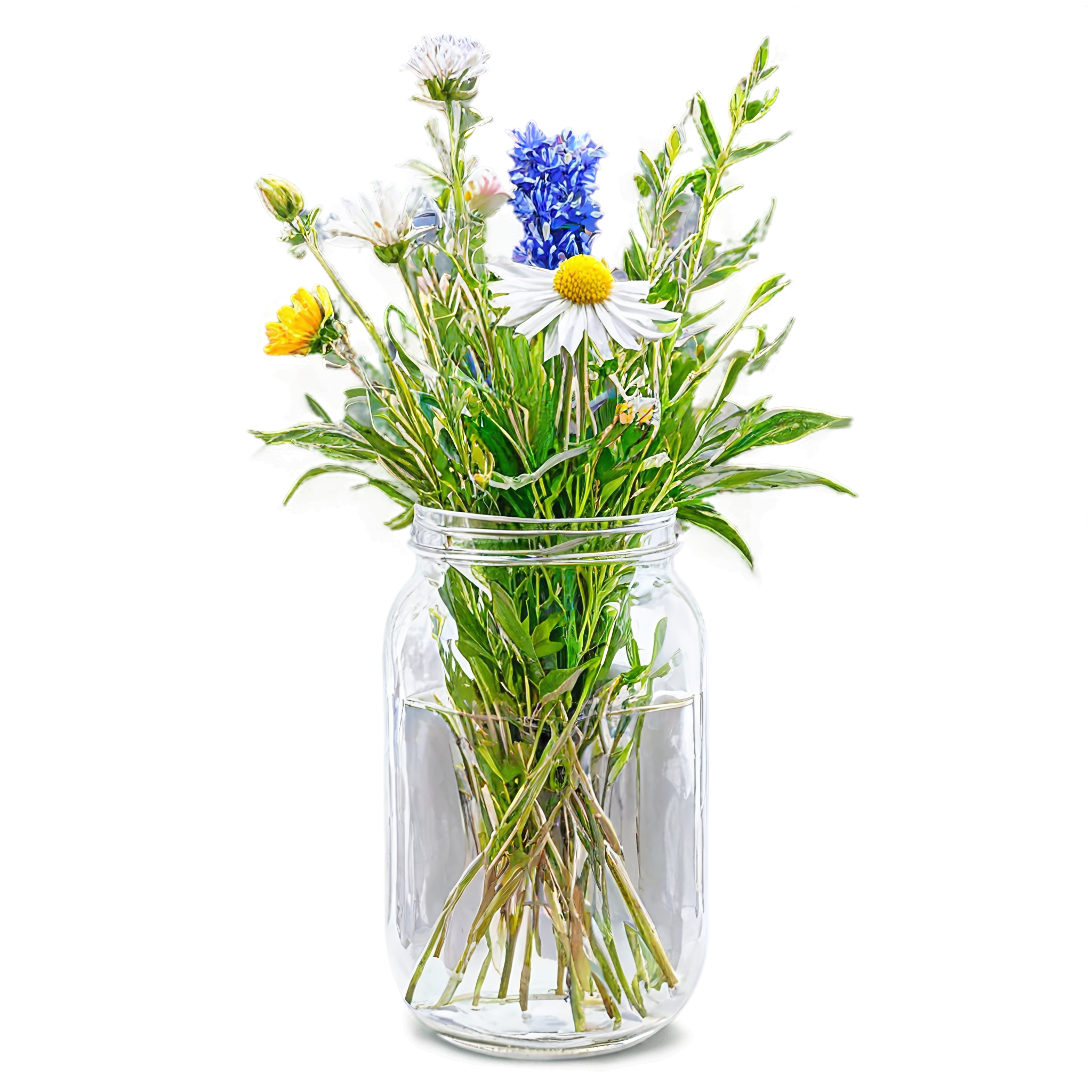 Wildflower clipart images are standalone botanical illustrations — watercolor-style bouquets, individual stems, and floral arrangements — saved as transparent PNG files. Unlike stock photos that include backgrounds, clipart elements are designed to be layered: drop them onto a wedding invitation, a greeting card template, a planner page, or a social media post and they blend seamlessly with your design. These wildflower-in-a-jar compositions pair the organic charm of meadow blooms with the familiar shape of a glass vessel, creating versatile elements that work in rustic, cottage, boho, and modern design styles alike. Each image in this collection was generated with AI-assisted watercolor techniques, curated for color accuracy, and exported at 2048x2048 pixels with a fully transparent background.